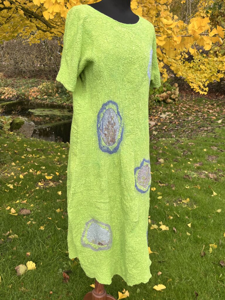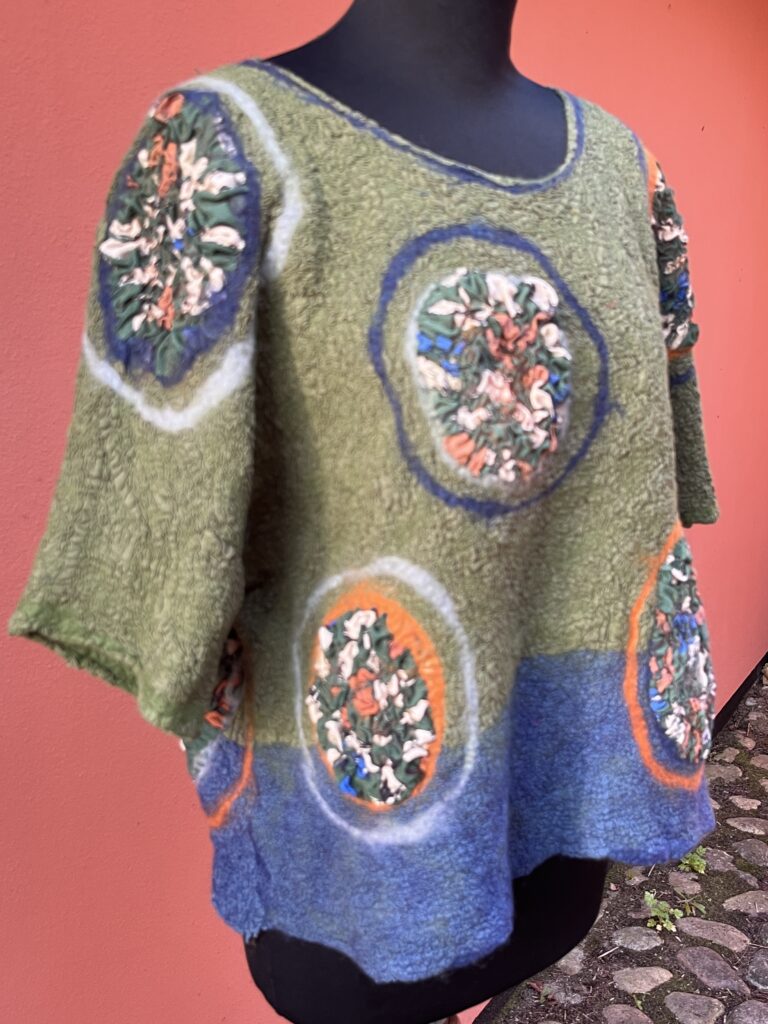 Jeg skaber nyt tøj af kasserede silkesarier og genbrugstøj ved hjælp af nunofilt-teknikken – en særlig metode, hvor uld og tekstil filtes sammen til et nyt, levende materiale med struktur og dybde. Resultatet er unikt, farverigt og komfortabelt tøj, hvor hvert design får sit eget udtryk og fortælling. For eksempel, bluser: